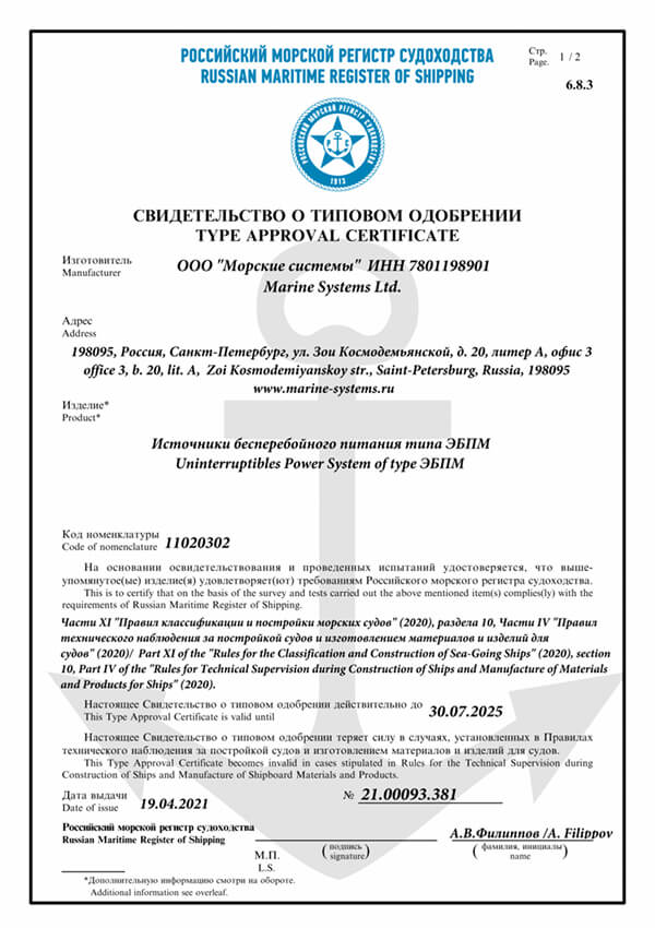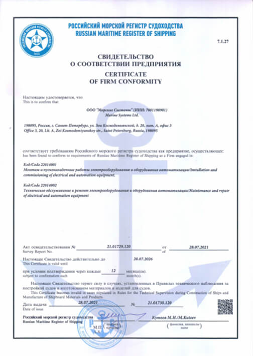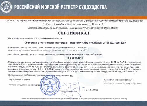Высокое качество производимого оборудования — основа философии компании «Морские системы». Мы обеспечиваем соответствие нашей продукции и процессов международным и отечественным стандартам (ISO, РМРС, РКО), подтверждая это сертификатами на все процессы производства и продукцию.